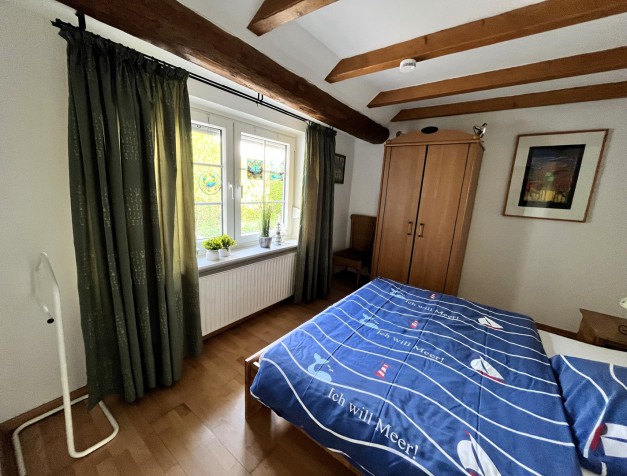 Nicht zu ändern sondern den alten Bauweisen geschuldet und damit auch wesentlich zum Charakter des Hauses beitragend sind die Raumhöhen von 2,30 m, sichtbare Holzbalkendecken, eine ziemlich steile Treppe zum Obergeschoss und ein Grundriss der es erlaubt durch mehrere Aussentüren aus verschiedenen Räumen in den Garten zu gelangen.